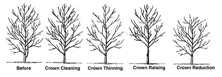 Crown lifting is the selective removal of the lower branches of a trees crown to increase the distance between the base of the canopy and ground level. This type of pruning should, if possible, be carried out before a tree reaches maturity in order to avoid large wounds. This allows more light through and can prevent obstruction.
